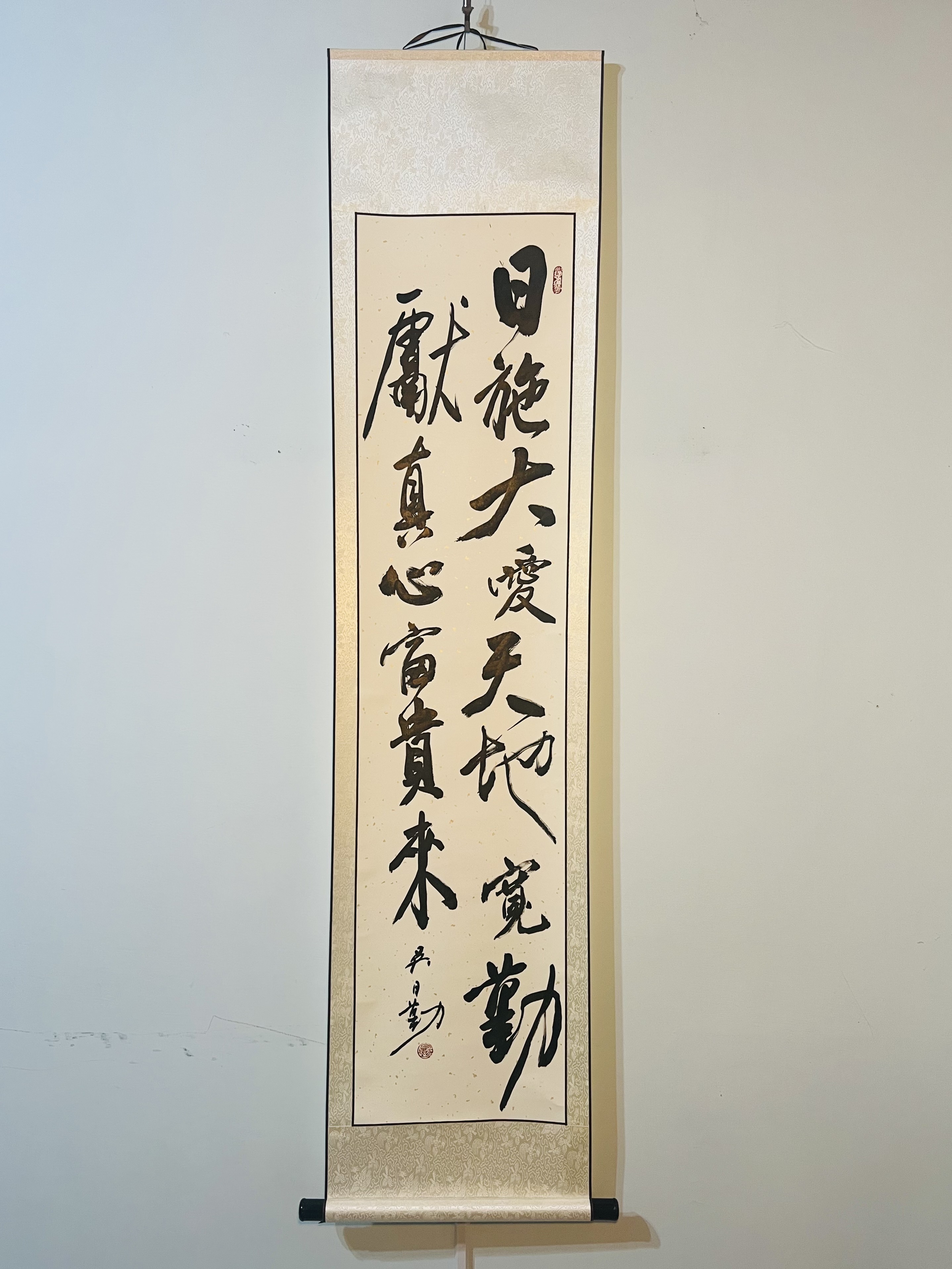 這是一幅藏頭聯,將「日勤」老師的名字鑲嵌在句首。吳老師自小臨北魏碑帖,所以書法顯得特別的自由靈動。「慷慨好施的必得昌盛,恩待他人的必得恩待。」(箴言11:25)。比爾蓋茲承諾將他的財產99%(2000億美元,約6兆新台幣)在20年內投入他與前妻創立的基金會,所以平均每日會捐出8.5億新台幣的「大愛」;你沒有看錯,20年平均一天捐8.5億,這就是勤獻真心的威力。有日施大愛的願心,才能擁有如天地之寬的容器來承載巨量的財富。